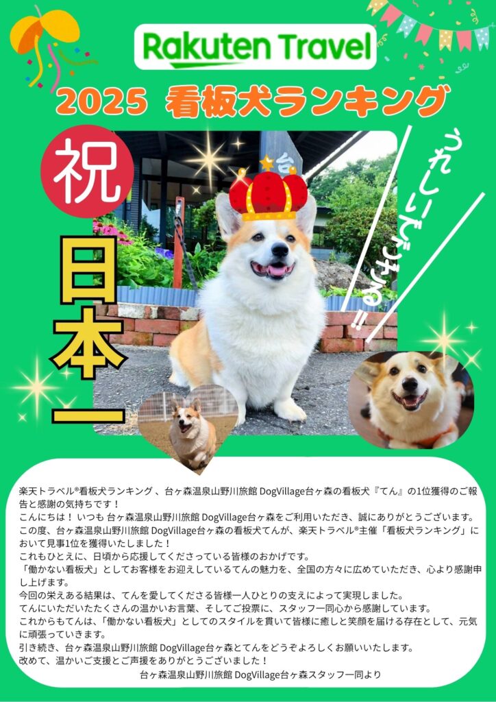 楽天トラベルの看板犬ランキングでDogVillage台ヶ森の看板犬「てん」が1位となりました!!