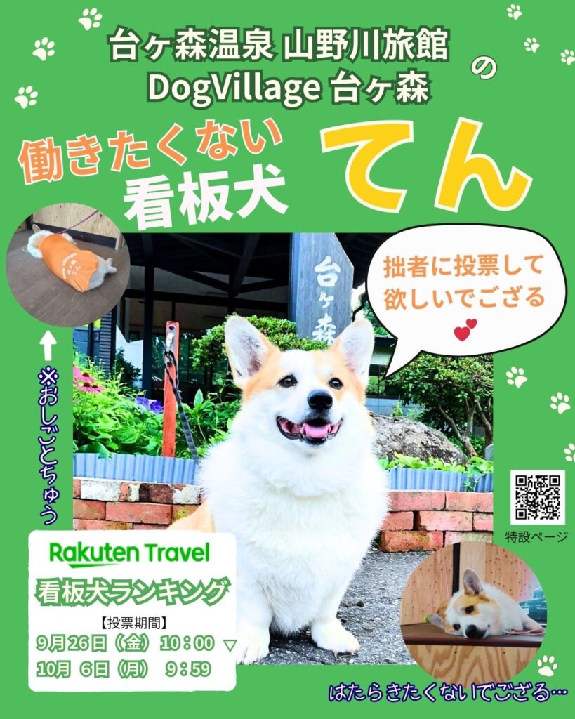 楽天トラベルの看板犬ランキングに旅館のコーギー「てん」がエントリーいたしました!